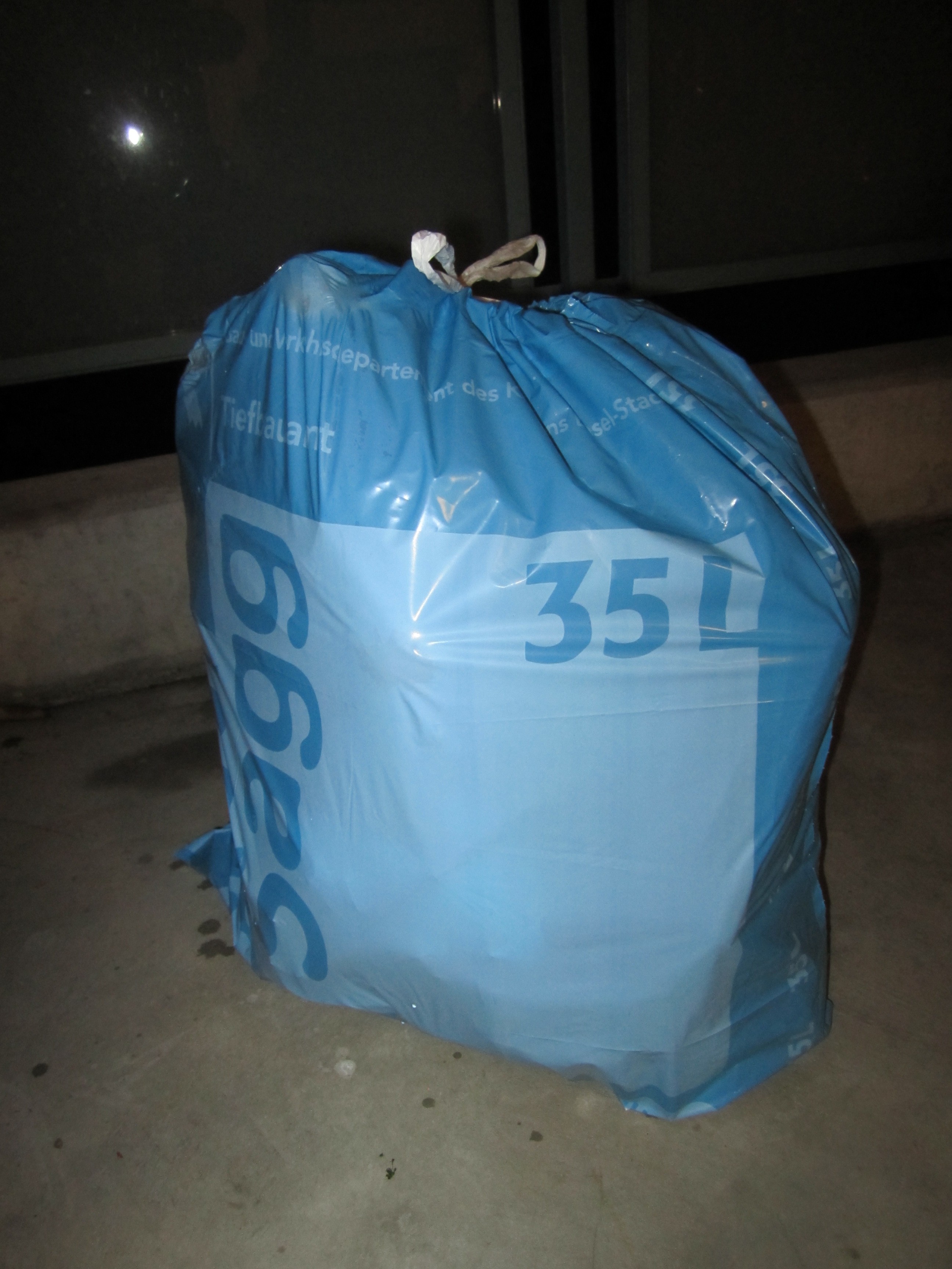 When I first came to Switzerland in 1998, I tried to put out my garbage in a standard black garbage bag. On garbage pick-up day (which generally occurs twice a week), my garbage was left on the curb, with a sticker on it, explaining that it needed to be in a special blue garbage bag called a ‘Bebbi Sagg’. I asked one of my neighbors and they told me that I could pick these up at my local grocery stores (Migros or Coop), at the cigarette and alcohol counter. What my neighbor didn’t tell me, is that the cost of these bags incorporates the taxes for garbage pick-up, and they cost an insane amount of money (10 x 17 Liter bags for CHF 12.00, 10 x 35 Liter bags for CHF 23.00, 10 x 60 Liter bags for CHF 33.00).